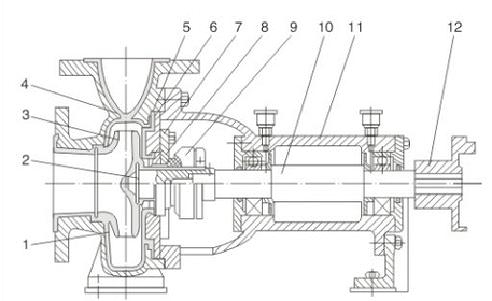 La bomba centrífuga química de revestimiento fluoroplástico IHF está diseñada de acuerdo con los estándares internacionales, con un cuerpo de bomba hecho de una concha de metal forrada con fluoropolímero (F46). La cubierta de la bomba, el impulsor y la manga del eje están formados por insertos de metal sinterizantes y presionantes envueltos en fluoroplástico. El sello del eje utiliza un sello mecánico de fuelle montado externamente, con un anillo estático hecho de 99.9% de alúmina de cerámica o nitruro de silicio. El anillo dinámico está hecho de material lleno de PTFE.